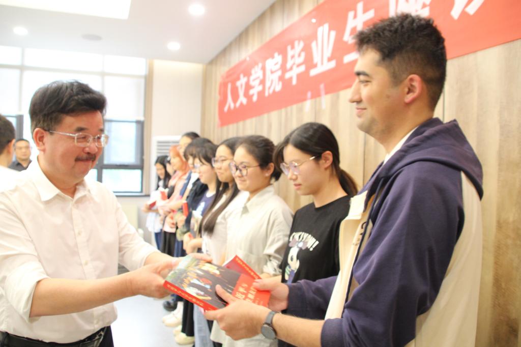 在热切交流与掌声中,刘久明依次为毕业生代表赠送《习近平与青年老员工们》一书并合影留念,祝福同学们拥有似锦前程,奔赴熠熠生辉的新征程。