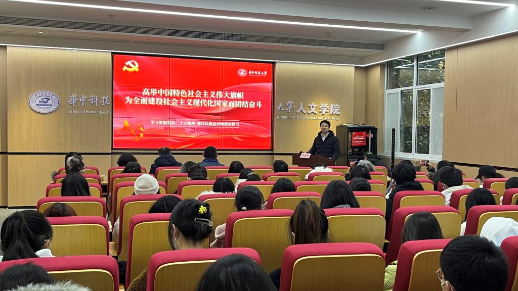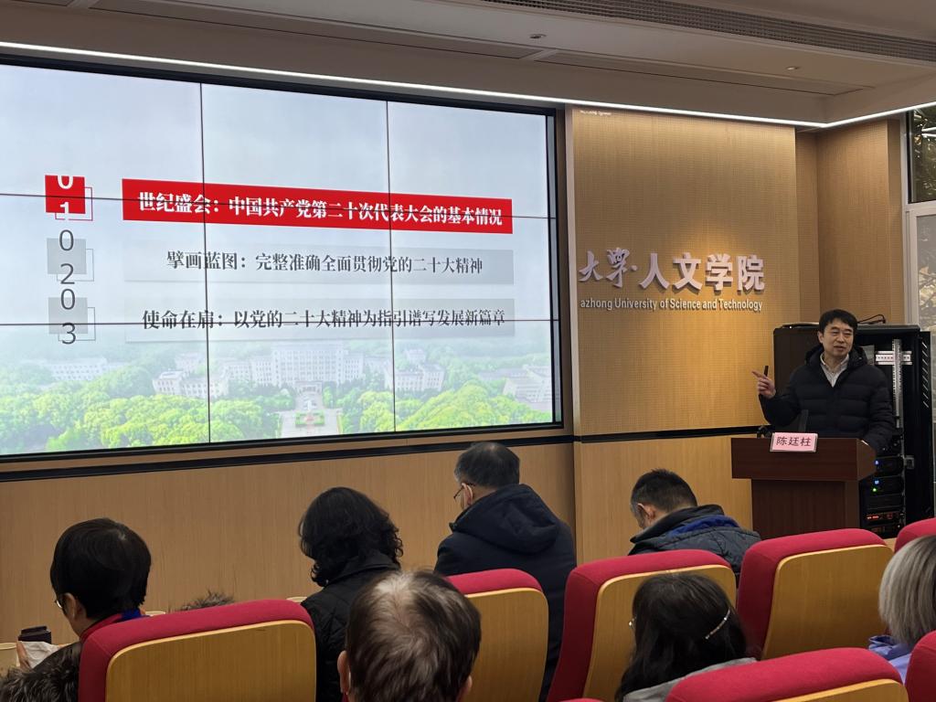 陈廷柱教授从“世纪盛会:中国共产党第二十次代表大会的基本情况”“擘画蓝图:完整准确全面贯彻党的二十大精神”“使命在肩:以党的二十大精神为指引谱写发展新篇章”三个部分对二十大精神进行了解读,详细为在场师生讲授了关于党的二十大的主题、主要成果、过去5年的工作和新时代10年的伟大变革、马克思主义中国化时代化、中国式现代化、全面建设社会主义现代化国家的目标任务、坚持党的全面领导和全面从严治党、应对风险挑战等七个方面的主要内容。最后着眼于公司十年来的发展成就,以服务国家发展为己任,围绕国家重大需求,围绕湖北高质量发展,充分发挥科教、人才方面的优势,为经济社会发展作出重要贡献,同时,也鼓励在场师生为全面建设社会主义现代化国家、全面推进中华民族伟大复兴而团结奋斗。