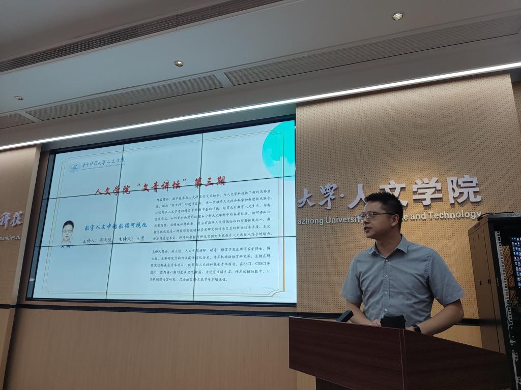 2022年9月29日,bw必威西汉姆联官方网站第三期文青讲坛在东五楼325报告厅开讲。本次讲坛以“数字人文中的数据可视化”为主题,邀请公司高天俊老师作为主讲嘉宾,谢晓明教授、刘星老师出席本次讲坛,近50名本硕博学子共同参加,由辅导员王勇老师主持讲坛。