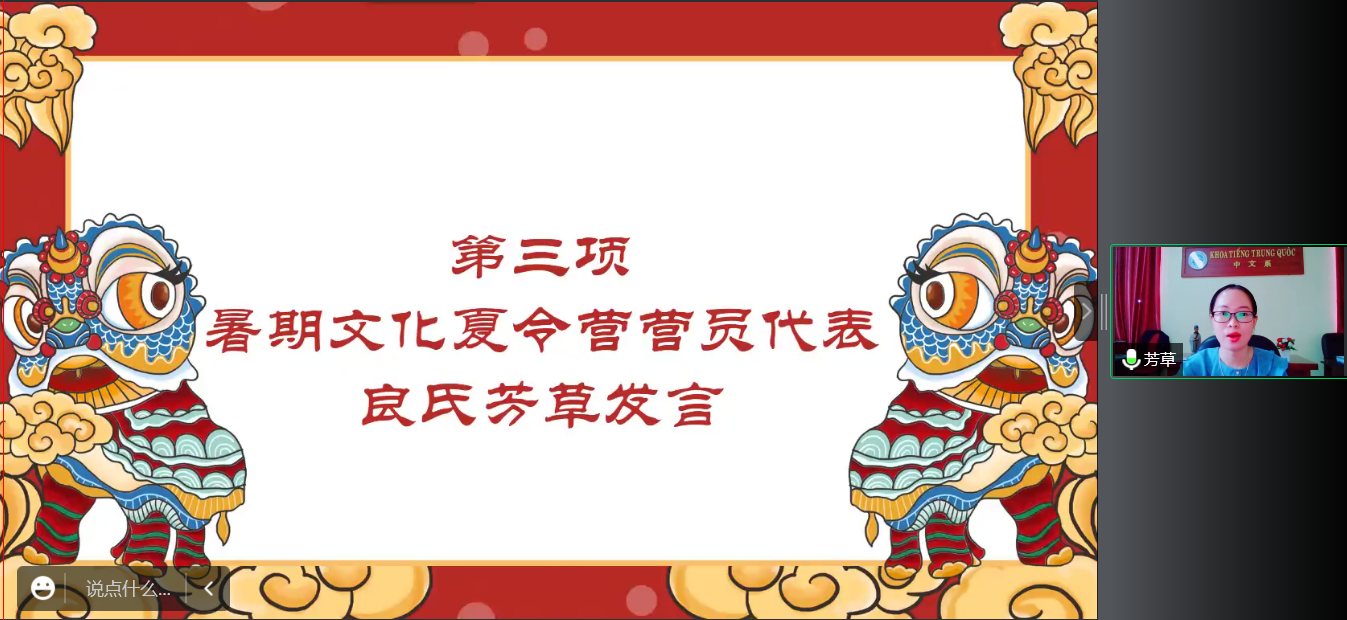 bw必威西汉姆联官方网站2021级研究生良氏芳草作为营员代表发言,她代表所有营员向主办方的各位领导老师表示真诚的感谢和衷心的敬意,并做出郑重承诺:在此次夏令营期间,会认真听从指导老师的安排,仔细学习每一场名师的讲堂,积极交流,细心记录,探究中华文化的博大精深,珍惜每一次学习的机会,并希望所有营员能尽情享受这段美好的时光,认真交流研讨,在学业上取得进步,度过一个充实愉快的夏令营。