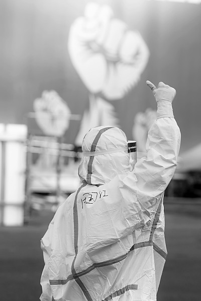 2月12日,医务人员在武汉体育中心方舱医院前竖起拇指为自己和同伴加油鼓劲。新华社记者肖艺九摄
