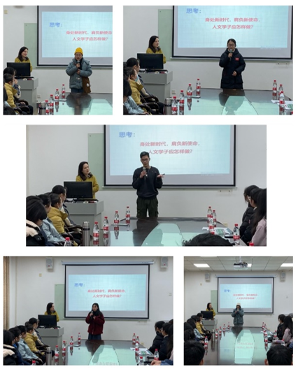 在交流环节中,同学们主动发言,就如何在新时代为新文科建设做出努力这一话题分享了自己的想法:中国语言文学类2002班李昕怡表示,中文专业的员工要加强文化自信心,积极与外国友人沟通,传播中华文化;马珏欢同学认为,要提升自己的思想认识和个人素质,积极寻求“突破”,打破外界对于中文员工只会写稿子、写繁体字等固有认知的束缚;古文字学2020级强基班的余佳玮说到,大家要保持良好的学习态度,制定合理的目标,夯实基础,多学多思,强健体魄,为社会发展贡献力量;中国语言文学类2001班雷玉洁、王逸凡则都紧密结合了“新文科”建设的要求,认为不仅要深化理论研究,更要重视实践和创新,进行多学科交叉学习,拓展思维的深度和广度,发扬创新精神,真正为时代变革做出努力和贡献。