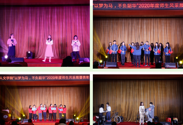 接下来的师生风采展环节中,研究生会文体部的四名同学首先带来了开场舞《Senorita》活跃了现场的气氛。以“旭日东升”为主题,风采展的第一部分包括五个节目:由张希乐、曾禹洁带来的舒缓治愈的口风琴弹唱《请回答1988》带我们回到了那个平凡却充满温情的年代;由历史所硕2001班全体成员带来的朗诵《时代青年》再现了梁启超先生《少年中国说》的责任和担当;秦文静带来的独唱《龙卷风》带给人热情和力量;屈馨梅带来的激昂的古筝独奏《战台风》和由杨蕾老师、侯静雅同学、王艺琳同学带来的舞蹈《锦瑟》则让我们感受到古典音乐和舞蹈的魅力。