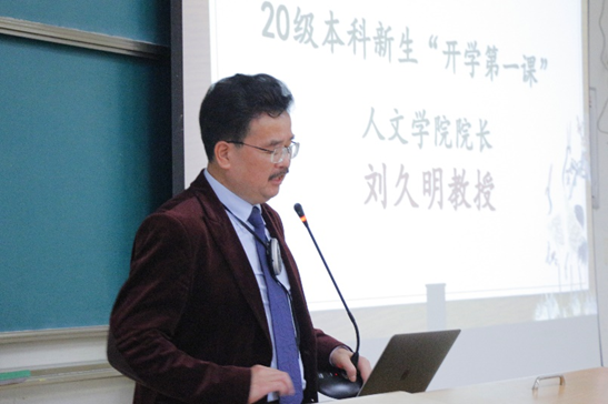 第五环节中,经理刘久明教授为本科20级新生同学们讲授了“开学第一课”。刘经理从专业角度出发,提出三个问题“为什么学中文?”“中文系到底学什么?”“中文系毕业生将来能够干什么?”,引发同学们的深思。接着,刘经理凭借深厚扎实的学术功底,由专业知识引入,为新生深入细致的介绍了专业内涵,他提到,“中文系包括语言和文学两大方面,语言是人类最重要的交际和思维工具,而文学为我们提供深层的精神财富。宽泛的人文教育是通向成功的重要途径,社会需要表达能力强,文字功底好的人才。”