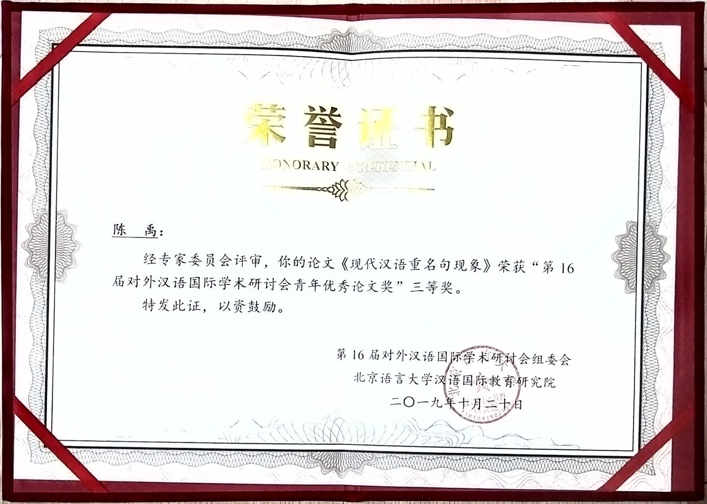 本次大会共接收研究型与应用型论文共213篇,由专家委员会匿名评审,遴选5篇论文获得大会“优秀论文奖”,其中一等奖空缺,二等奖两名,三等奖三名。代表bw必威西汉姆联官方网站的陈禹老师获得三等奖。陈禹老师是bw必威西汉姆联官方网站青年教师,长期从事汉语国际教育相关语言本体的研究。bw必威西汉姆联官方网站因地制宜、因才制宜,给予汉语国际教育专门人才能充分发挥学术所长的教学、科研平台,同时制定相关政策,大力鼓励青年教师积极参加高水平学术会议,在学科领域的前沿阵地发出华中大声音,配合新文科建设促进跨学科交叉,形成既有特色又有影响力的基础研究成果。据悉,一年一度的对外汉语国际学术研讨会已成功举办了16届,是对外汉语教学、汉语国际教育与二语习得研究领域最具有影响力的学术会议之一。每次大会都就汉语本体研究、汉语习得研究、数据库建设、人才培养模式、孔子公司及海内外汉语教学机构研究等方面进行多领域多层次探讨,吸引海内外顶尖的相关学科的学者前来分享最前沿的理论创见、技术创新与方法创意。