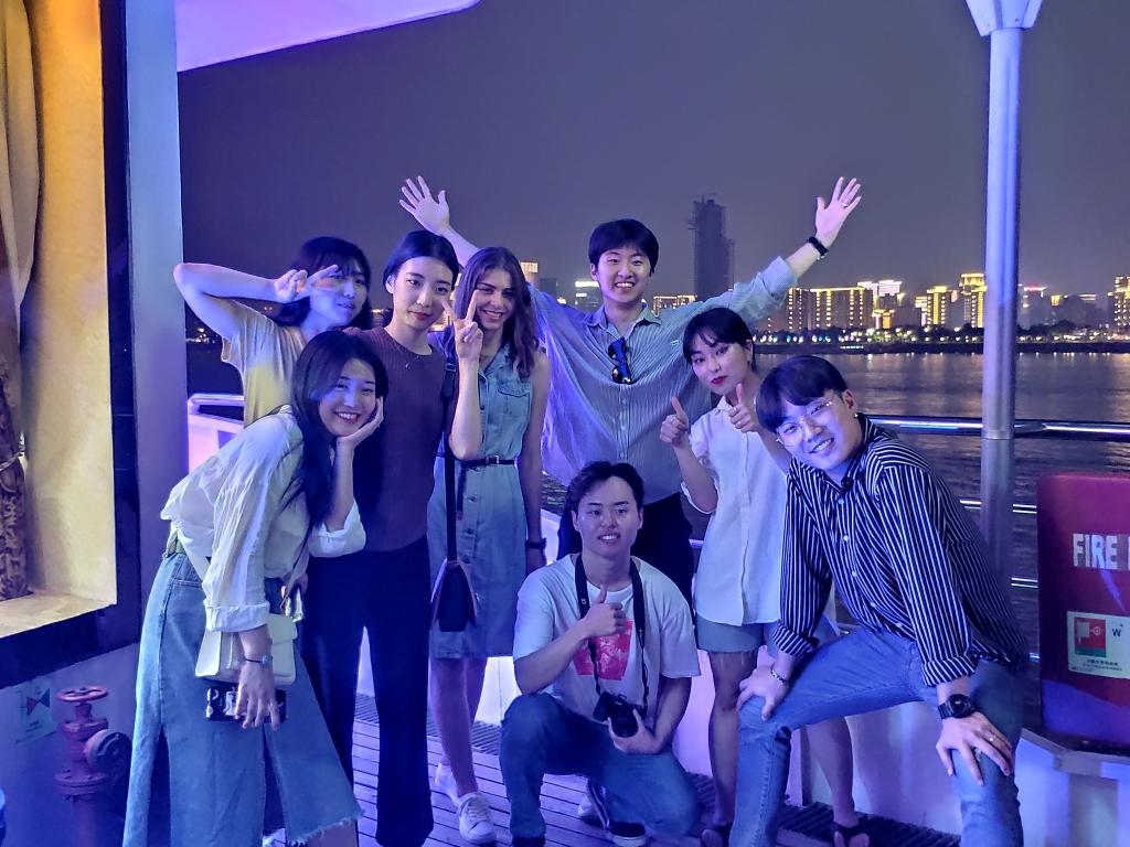 晚间,中外学子共同登上东湖号游船从粤汉码头出发。同学们在船上合影留念,与家人通话,共叙佳节。在江风的吹拂下,同学们乘船逆江而上,即将赏悦沿江的点点风光。首先映入众人眼帘的是汉口新江滩,以及像一座巨轮横卧在江畔的武汉港,在它旁边驻泊的是西安舰和303潜水艇。游轮上的广播为大家详细介绍了西安舰和303潜水艇的历史。游轮不断向前行驶,来到了被誉为“千樯万船之所归,货宝奇珍之所集”的九州名镇——汉口。长江与汉水交汇在此的“人”字形使武汉三镇自然天成。在汉水北岸便是闻名全国的防汛段——龙王庙,自清朝以来,它就是武汉三镇防洪的重中之重。夜色中的晴川阁和龟山电视塔别有风韵,“晴川历历汉阳树,芳草凄凄鹦鹉洲”,职工爱丽在游览中吟咏出崔颢的名句。万里长江第一桥和长江鹦鹉洲大桥不知不觉间也近在眼前,它们为武汉的经济发展做出了突出贡献。返程时,两岸的灯光秀表演引来了大家的惊叹。同学们一边观赏江岸炫丽的江城风光,一边欣赏着月圆之夜。