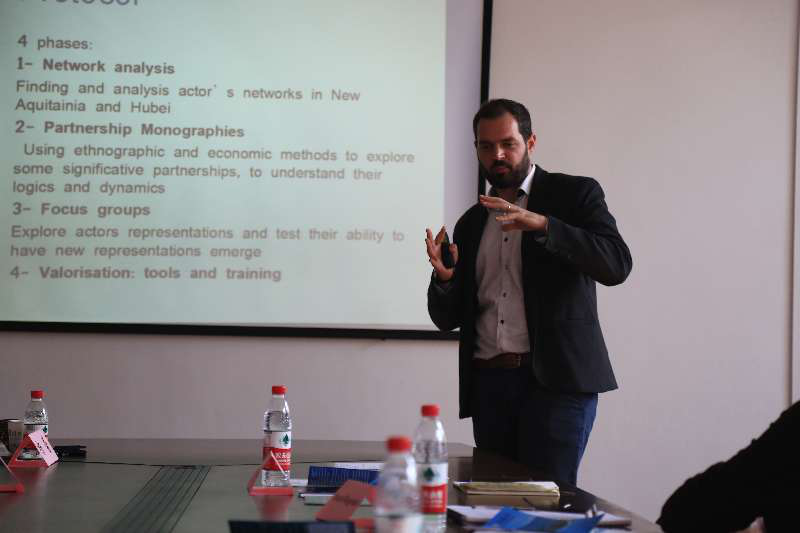 法方徐杨博士介绍波尔多大学社会学系、涂尔干研究中心与波尔多高等政治公司的相关情况。徐杨表示,波尔多大学高等政治公司是法国外省最优秀的政治公司,该校在国际关系研究历史悠久、积累深厚,而且该校新近成立了法国唯一的中国研究中心,这些都是推动合作的有利因素。涂尔干研究中心是波尔多大学、波尔多高等政治公司整合资源后形成了新的研究机构,关注科学技术、政治关系、经济发展等的社会效应与普遍意义,因而是一个综合性的研究单位。研究中心Vendassi副教授概述了法方的研究团队,并表达与中方进行开放、多元的合作研究的愿望。Ragouet简单介绍了波尔多大学社会公司的状况,并就科研合作与员工交流的条件予以说明。