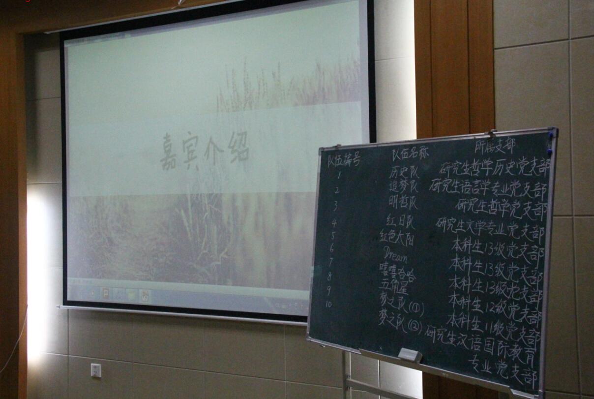 10月26日19时,由公司党支部主办的“‘中国梦·铭我心'之党知识竞赛”拉开帷幕,公司党支部副书记陈小丽、学工组成员闫俊懂、黄讷敏、熊翔宇、彭小乐、宋海佩等辅导员悉数到场,他们与所有的参赛选手一起共同见证了今天精彩的赛事。本次比赛共十支参赛队伍,每队四五人左右,分属不同的支部,其中研究生队伍有“研究生现代文学党支部”、“研究生语言学党支部”、“研究生汉语国际教育党支部”等,本科生队伍有“13级党支部”、“12级党支部”等,每个支部至少一只参赛队伍,“13级支部”最为活跃,共有3支参赛队伍,居今日参赛队数量之首。