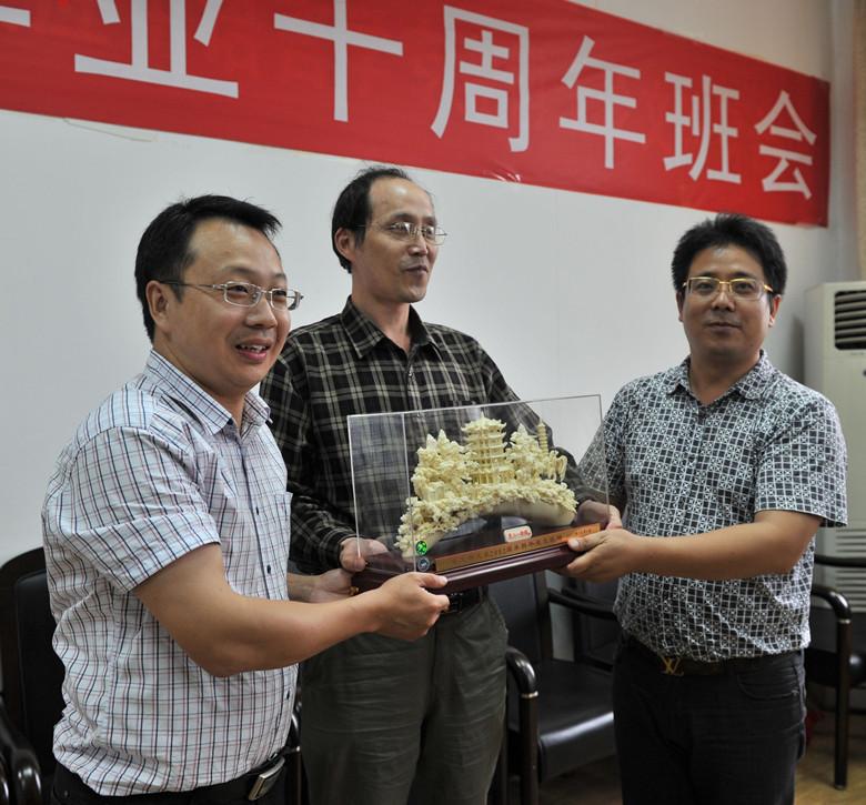 会上,回校同学代表中文系98级本科毕业生向中文系赠送了“更上一层楼”骨雕礼品。