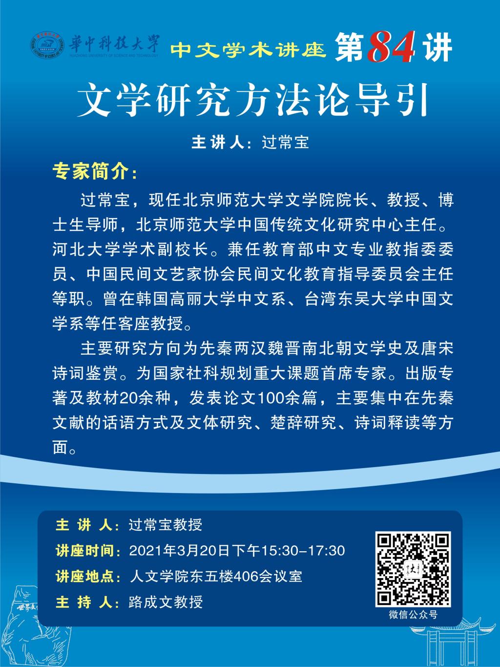 专家简介:过常宝,现任北京师范大学文公司经理、教授、博士生导师,北京师范大学中国传统文化研究中心主任。河北大学学术副董事长。兼任教育部中文专业教指委委员、中国民间文艺家协会民间文化教育指导委员会主任等职。曾在韩国高丽大学中文系、台湾东吴大学中国文学系等任客座教授。