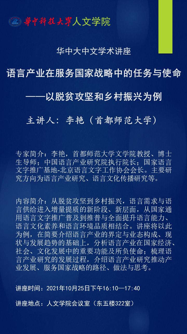 华中大中文学术讲座第94讲:语言产业在服务国家战略中的任务与使命——以脱贫攻坚和乡村振兴为例