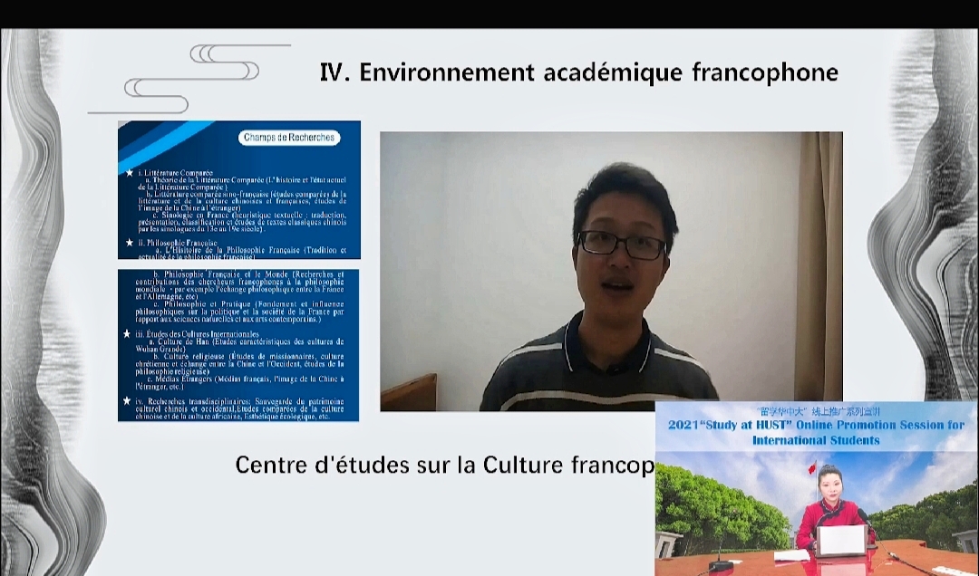 12月18日下午,公司2021国际员工“留学华中大”线上推广系列宣讲bw必威西汉姆联官方网站专场顺利举行。bw必威西汉姆联官方网站杨蕾老师出席本次宣讲活动。来自法国、俄罗斯、泰国、印度尼西亚、柬埔寨、加蓬、坦桑尼亚等多国师生代表受邀参加此次宣讲会。本次活动由国际教育公司招生与对外合作办公室项目主管余文昌主持。