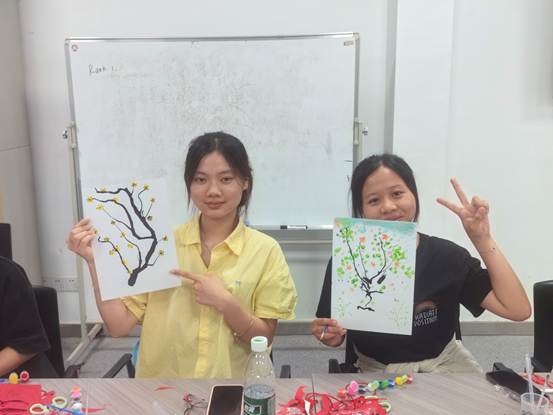 越南 阮氏清苍和武氏明映:“吹墨画!这绝对是夏令营里最让人惊喜的体验之一!看着一滴墨在纸上自由流动、变化,那种感觉特别奇妙,好像我们不是在‘画’,而是在和自然一起‘玩’创作。墨汁自己跑出来的形状,比我们想画的还要美,还要有意境!两个人一起对着纸吹气,你帮我、我帮你,看着一幅意想不到的作品慢慢诞生,整个过程充满了笑声和‘哇!’的惊叹。大家说这是‘自然的笔触’,我们完全同意!它让我们感受到一种特别的自由和放松,艺术原来可以这么好玩,这么充满意外惊喜。这份一起创造‘未知美’的快乐,会是我们关于这次武汉之行最特别的记忆!”