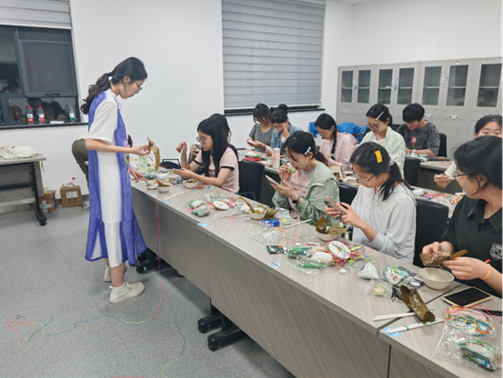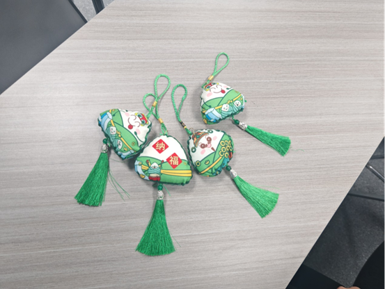 端午粽香飘,香囊寄深情。活动现场也为同学们准备了粽子香包的制作材料。中外学子穿针引线、填充香料、缝制造型。职工们也专注地将艾草与祝福一同纳入香囊,尽管手法略显生涩,却热情满满。大家相互交流设计灵感,融入不同元素,创作出一个个可爱且祝福满满的香包。