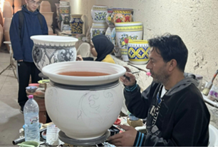 1月26日下午,实践队来到当地一家陶瓷厂参观学习。厂内陈列了大量陶器,种类丰富,形态多样。该厂仍坚持以手工制陶为主,实践队员一起观摩了工匠制陶与上色的过程。突尼斯陶器颜色鲜艳,图案与中国传统陶器也较为不同。