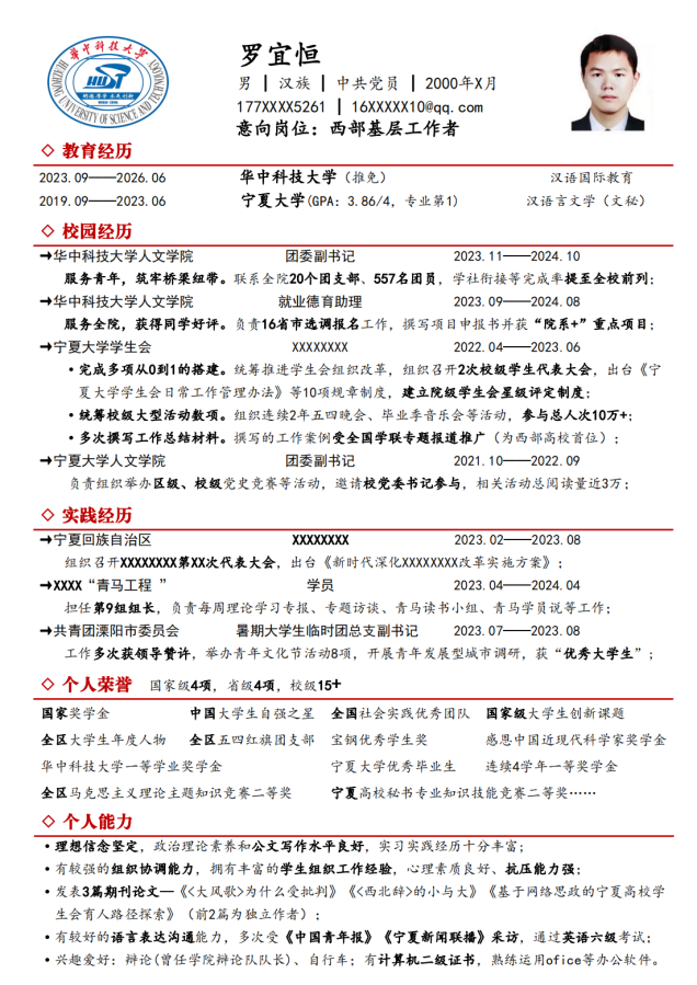 3.强调校园员工干部和政务实习经历,突出差异化优势。