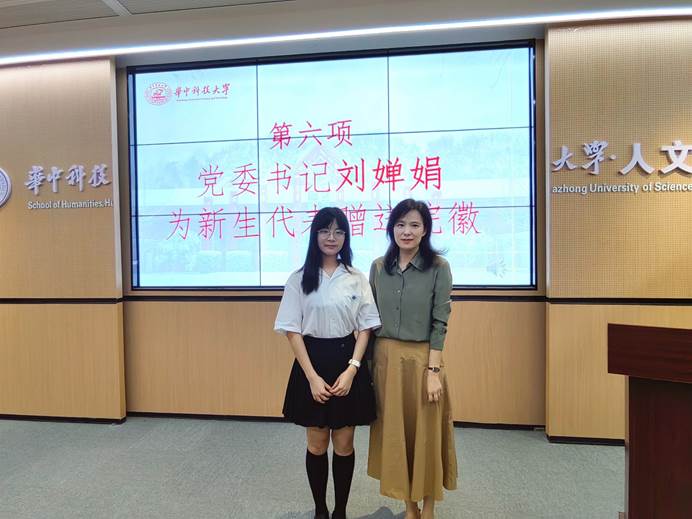 接着,党委书记刘婵娟为2023级硕士新生代表周珩同学佩戴院徽,其余同学自行佩戴院徽,这样一个有仪式感的佩戴院徽环节,便是希望各位同学都能无愧“人文学子”的身份。