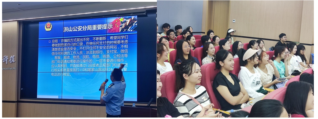 随后,熊警官结合自身工作见闻,为同学们介绍了27种防诈骗方式,重点强调要防范网络电信诈骗,如:警惕校园套路贷、P2P平台投资诈骗、帮助淘宝商家刷信誉及帮助在网上发表论文进行诈骗等。