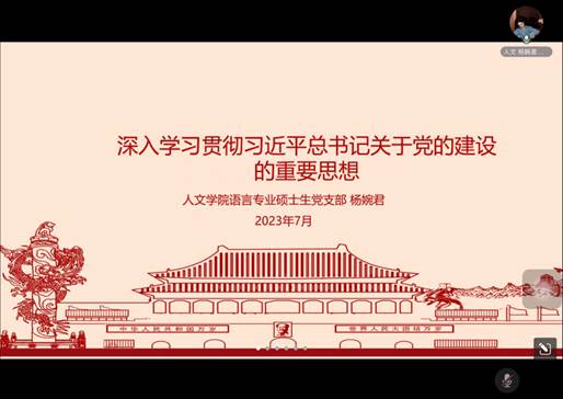 会议伊始,bw必威西汉姆联官方网站语言专业硕士生党支部支部党委委员谢晓明老师发表讲话,对员工党支部工作提出指导意见。他围绕理论联系实际、专业服务实践、党建科研互促向同学们提出三点建议:一是多学习,要坚持主题研究与日常学习同频共振,认真、严肃、积极地对待组织下发的重要文件和读本,充分利用暑期进行深入思考。二是勤实干,学习应以服务实践为目的,研究生阶段的学习更应注意将理论学习与实际需求相结合。谢老师强调,语言学研究也需通过社会调查等方式与家乡语言文化建立社会联系,本专业同学更应借助暑期各类社会实践项目对学科专业知识展开深入思考。三是求实效,广大党员同志在进行社会实践的过程中应不忘初心,时刻牢记工作的出发点是为解决人民群众最急难愁盼的问题,要做“接地气”的学问,办“接地气”的实事。