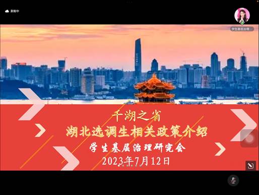 最后,来自员工基层治理研究会的刘泓利同学向各参会成员介绍了湖北省选调的相关情况。她重点讲解了选调生的分类、近几年湖北省选调招录情况、报名条件、选调流程、信息渠道等,帮助大家全方位了解湖北选调就业的信息,同学们收获颇丰。
