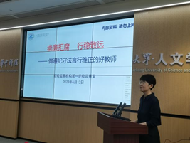 罗君君以“崇廉拒腐、行稳致远——做遵纪守法言行雅正的好教师”为题,从三个方面进行了宣讲,强调了走进院系开展清廉教育的重要性。一是认清新形势,我们不仅要深刻认识到新时代十年党和国家事业取得的历史性成就、发生的历史性变革,也要牢记习近平总书记关于全面从严治党永远在路上、党的自我革命永远在路上的重要论述和深刻判断。她传达了中央纪委国家监委关于深化中管高校纪检监察体制改革的有关意见精神,还分析了中管高校存在的“六个不足”问题,强调全面从严治党没有特殊、没有例外。二是守好铁规矩,她强调作为一名高校教师、党员干部,既要深入学习《中国共产党党内监督条例》《中国共产党廉洁自律准则》等重要文件,也要严格遵守《中国共产党纪律处分条例》《中华人民共和国监察法》《中华人民共和国公职人员政务处分法》等党纪法规。三是以案为镜鉴,她主要对选人用人、招生考试、科研经费、学术不端等十个方面的违法犯罪典型案例进行了剖析,强调崇廉拒腐是党风廉政建设也是高校师德师风建设的重要内容,作为一名高校老师,更要一以贯之,责任以行,把培养“廉洁人才”作为教书育人之己任,培养“亲”“清”的师生关系,在高校廉洁文化建设中彰显教师的责任与担当。