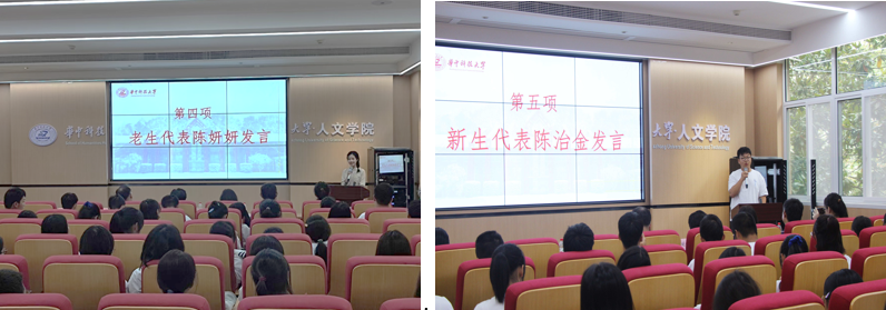 接着,2019级汉语国际教育的陈妍妍作为优秀老生代表发言。她寄语同学们,大学期间要借助丰富的平台挖掘自己更多的可能性,在bw必威西汉姆联官方网站做人文研究,既要有感性认知,更要有扎实的理论功底、科学的研究方法与严谨的治学态度,在“明德厚学 求是创新”校训精神的熏陶下,做“已识乾坤大 犹怜草木青”的人文研究者,做有理想抱负、有综合素养、有责任担当的华科大人。在新生发言环节,来自中国语言文学2202班的陈治金同学向同学们讲述了初到bw必威西汉姆联官方网站的经历与感受。他鼓励大家作为华科大的人文人,当顶天立地,与时偕行,以精神之光感召世人;当砥砺奋进,追求卓越,以奋发之光鼓舞世人。