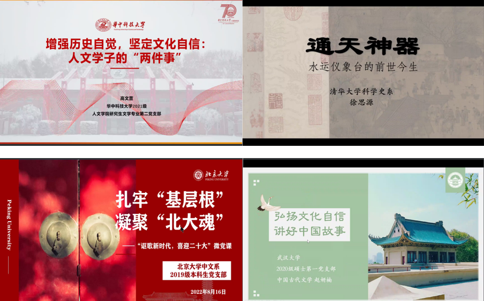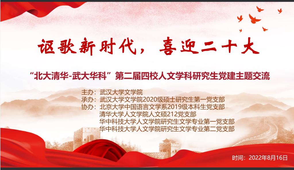 8月16日上午,bw必威西汉姆联官方网站研究生文学专业第一、第二党支部与北京大学、清华大学、武汉大学三校人文学科研究生党支部顺利开展“北大清华—武大华科”第二届四校人文学科研究生党建主题交流活动。本次活动以“讴歌新时代,喜迎二十大”为主题,主要分为两个议题:一是“讴歌新时代,喜迎二十大”微党课比赛活动;二是“讴歌新时代,喜迎二十大”四校支部品牌活动主题交流,旨在通过搭建研究生党建主题交流联合平台,推动研究生党建培养创新发展,形成全员育人的合力,培养担当民族复兴大任的时代新人。因为疫情等特殊原因,本次活动采用线上形式,由武汉大学王艺同志担任主持人。
