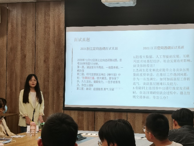 紧接着,分享会进入嘉宾分享环节。第一位分享人是2018级语言学及应用语言学专业硕士研究生李莉莉,她成功通过了浙江选调生和江西选调生的笔试和面试,最终签约江西选调生。李莉莉结合自身经历,从定向选调生介绍、重要时间节点、笔试内容、面试准备、资料推荐和备考建议六个方面入手,深入细致地为大家分享了江西定向选调生和浙江定向选调生的相关经验,鼓励大家充分了解相关信息,做好时间规划,提高自身实力的同时放平心态,从容应考。