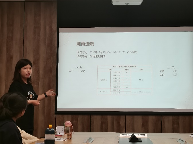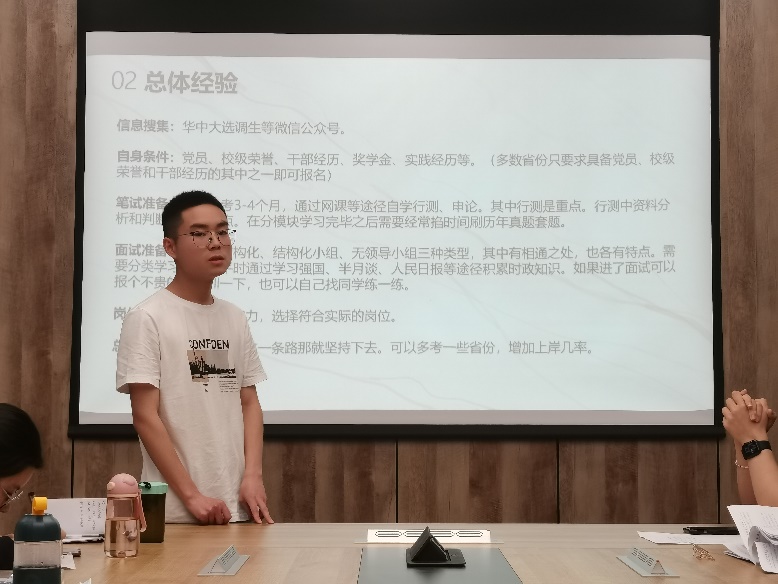 第三位分享人是2019级汉语国际教育硕士研究生王思琦,她第一志愿报考湖南株洲市直选调,已通过笔试,目前进入面试考察阶段。王思琦结合自己成功的经验和失败的教训,为大家分享了自己报考江苏省名校优选、中央选调和湖南选调的经历,并总结归纳了自己的笔试和面试经验,内容丰富,情感真挚。