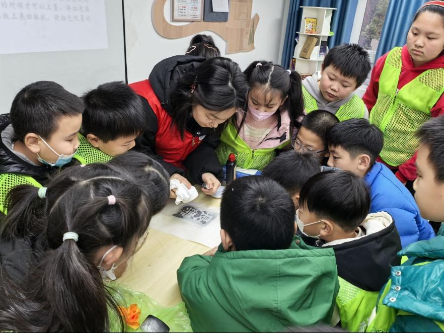 非遗拓印体验环节将课堂推向高潮。孩子们亲手铺宣纸、蘸墨汁,在志愿者指导下制作汉字拓片。纸墨交融间,古老的文字焕发新生。“中国文化真是博大精深!”来自民航里社区的尚芷宇同学捧着作品自豪地展示。通过动手实践,孩子们不仅理解了汉字的结构之美,更深刻体会到文化传承的深远意义。