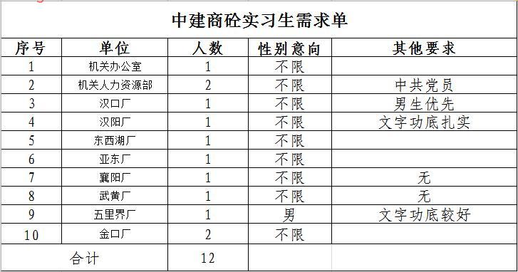 中建商品混凝土有限公司是以生产预拌商品混凝土为主,多产业、集团化、跨区域的专业公司,隶属于世界500强企业——中国建筑工程总公司,公司性质为国有企业。公司为中南地区最大的混凝土生产企业,业务范围分布于武汉、成都、天津、襄樊、西安等地区,并将逐步覆盖全国其他重点区域市场。公司自2013年与中建商品混凝土有限公司建立实习实践基地以来,每年都有一批员工前往公司实习,积累了丰富的工作经验,个人能力得到了很大的提高。今年中建商品混凝土有限公司实习计划已下发,具体如下: